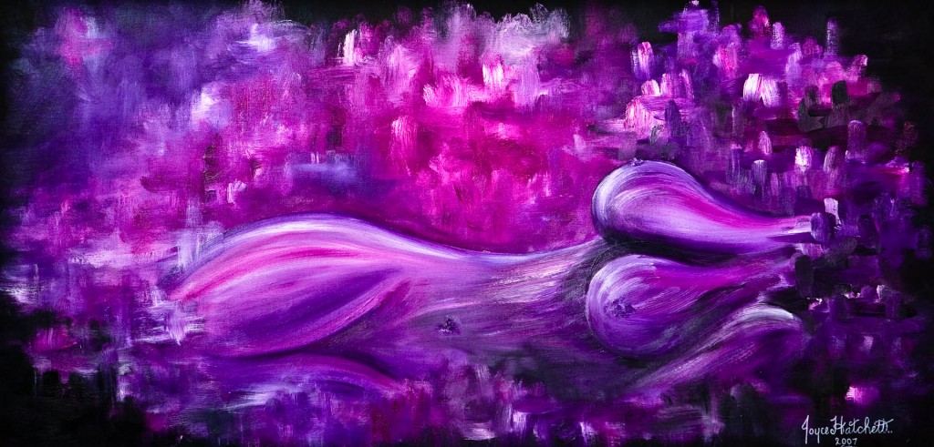 I used a model for this piece and could envisage it being created as a nude in such lovely deep yet vibrant colours of purples, mauves and pinks with a deliciously black background to enhance the image. It is a contemporary piece created from a nude model. I wanted to create a warm aura effect glowing from the curvaceous body and its curves. I really like this piece and interestingly enough so do many ladies. It is vibrant, attractive to the eye with a mysterious and strong black background. It hangs in my gallery for sale.