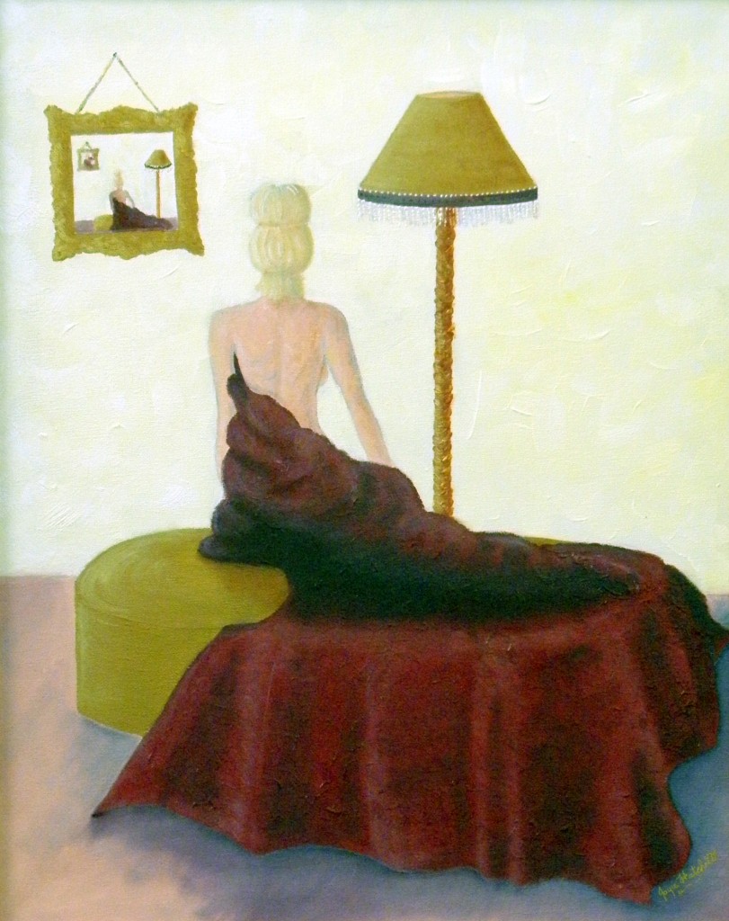 This particular semi nude I wanted to create for quite some time prior to. I had the idea of seating a semi nude lady simply and elegantly with her partially exposed back swathed in a beautifully warm and comforting deep burgundy velvet wrap on an old fashioned oval shaped automan. I absolutely lovely the feel of velvet with a passion as I do the colour of burgundy and this is how I wanted the lady in the painting to feel so to speak. I also wished to, as I do with most of my work, create subtle appearances or things within the piece to make the viewer work. I created a second and third painting within the painting by painting a mirror image ‘within the painting within the painting’. This painting currently is for sale and lives at Be Beautiful beauty salon in Marlston Hill in Bunbury.