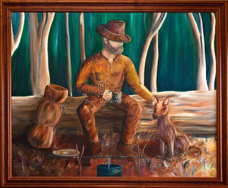 Even though I was born in Scotland, I have always loved the Australian bush and the old Aussie way of life. I love the old Aussie films on the lifestyle of the people living hard times pioneering the Australian bush and heat and the journeys they had. I enjoy the old Aussie sense of humour and slang. I especially love the dinkum Aussie bloke/battler who roved from one town to the next shearing and picking up what work he could along the way which is how this painting came about. I created it in oils with a contemporary effect displaying the the Swaggie and his loyal friend – half dingo half something else – dog/mate after sharing the warmth of the evening campfire, cuppa from the billy, and tucker they are settling in for the night. The swaggie shows his loyal mate a sign of affection by reaching to pat him – but not with too much affection so as not to tarnish that tough Aussie nature/exterior. The swaggie’s swag ready and waiting leaning up against the fallen tall timber of our south west in readiness for retiring till the break of next morn.